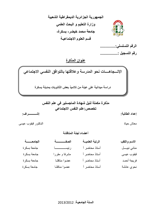 رسالة الماجستير عن التوافق النفسي الاجتماعي pdf عنوان المذكرة كاملة : الاتجاهات نحو المدرسة و علاقتها بالتوافق النفسي الاجتماعي pdf…